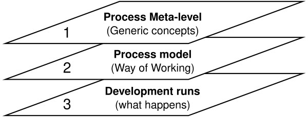 Одна и та же модель процесса многократно используется для разработки многих приложений и, таким образом, имеет множество экземпляров. Одно из возможных применений модели процесса состоит в том, чтобы предписать, как вещи должны/должны/могли бы быть сделаны в отличие от самого процесса, который действительно происходит. Модель процесса — это предвидение того, как этот процесс будет выглядеть. Каким должен быть этот процесс, будет определено в ходе фактического развития системы[10].
