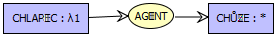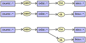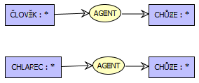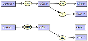 Этот граф отражает утверждение «мальчик идёт». Содержит два концепта — «мальчик» и «идти» (человек, выполняющий действие) и связь «агент», которая показывает, что мальчик — это субъект действия. Это классический пример диадического (двухместного) отношения. При большем числе связей говорят о триадических, кватернарных и, в общем случае, n-арных отношениях.