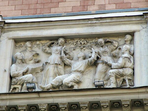 В ноябре на портике главного фасада разместили четыре скульптуры: Танцовщица, Скрипач, Трубач, Балерина. Они были в утверждённом проекте 30-х годов, но во время строительства здания установлены не были. Гипсовые миниатюры хранились в Музее архитектуры имени Щусева[11] и были воссозданы в масштабе скульптором Андреем Коробцовым.