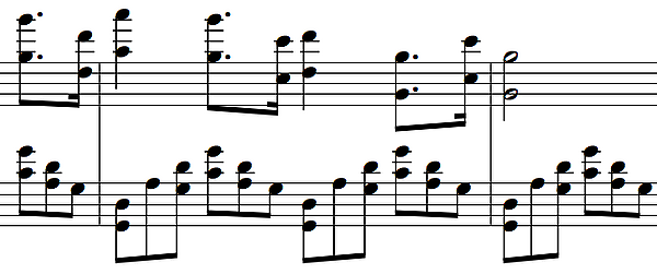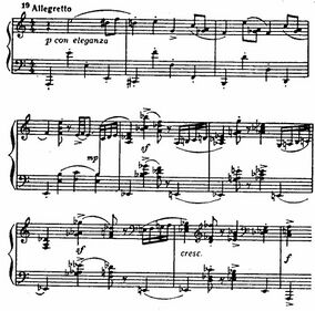 - Экспозиция.Она в свою очередь тоже делится на три части: Экспозиция главной партии. Главная партия этой части, классический пример «скифского» Прокофьева, — буйная, напористая и чрезвычайно быстрая, поражает своим диапазоном и резвостью. Её характер подобен необузданной стихии природы, чувств и переживаний человека, находящегося на грани. Сопоставляя главную партию 1-ой части и финала с музыкальной точки зрения, можно сказать, что они разительно отличаются не только темпом и характером, но и фактурой. Представленная фактура максимально угловата и квадратна, отсутствует деление на мелодию и аккомпанемент. После проведения главной следует спокойная связующая партия, которая представляет собой длительные аккорды у фортепиано. За ней следует неторопливая побочная партия.