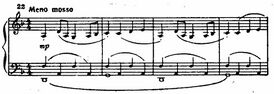 - Экспозиция. Её в свою очередь можно условно разделить на экспозицию главной партии, экспозицию побочной партии и репризу, плавно перетекающую в разработку. Характеризуя главную партию, можно сказать, что она, наполненная печалью, возвышенной задумчивостью и патетикой, является прекрасным примером интроспективной лирики, предвосхитив «Надзвёздную лирику»[7] побочных партий Шостаковича. «Initium»[8] главной партии чрезвычайно интересен тем, что тема даётся в размере 4/4, тогда как аккомпанемент — в размере 12/8. Рассматривая аккомпанемент как самостоятельную единицу становится понятно намерение композитора продемонстрировать пустоту на грани музыкального фола. Все интервалы, входящие в материал являются совершенными, они не несут ладотональный окрас. «Motus»: Тема является модулирующей, тональность темы меняется следующим образом: g-cis-fis-g. Вернёмся к форме концерта. Главная партия проходит у фортепиано в сопровождении струнной группы, музыкальный материал которой составляет самостоятельную мелодическую линию. Затем Прокофьев делит тему и проводит её у всего оркестра. Необычно и крайне тесное сплетение главной и связующей партий. Тема проходит у деревянных духовых, фортепиано, у струнных проходит связующая партия, которую можно охарактеризовать, как мощную и волевую. Начинается экспозиция побочной темы. Побочная тема в темпе Allegretto с первых секунд создаёт невероятно живой, игривый образ, присущий стилю Прокофьева. Немаловажным фактором, создающим контраст, является в первую очередь штриховое разнообразие. Побочная партия проводится в тональности мажорной субдоминанты, то есть в C-dur. Также контраст придаёт тип аккомпанемента, в отличие от плавного, напевного, лиричного аккомпанемента главной партии, этот — лапидарный, сухой, стаккатированный. Обратимся к форме этой части. Побочная партия проходит у фортепиано в сопровождении струнных, затем «подхватывается» деревянными духовыми, у фортепиано проводится изящный мелодический фрагмент, которым претворяется побочная партия. Затем Прокофьев повторяет свои манипуляции с темой, разделяя тему на фрагменты и поручая различным инструментам оркестра. После целого ряда метаморфоз тема изредка становится узнаваема в виде интонаций, слышимых на фоне фигурационных пассажей фортепиано. После лапидарного эпизода с триолями на стаккатиссимо постепенно возвращается лиричный характер, спокойный оркестровый эпизод возвращает нас в «мир суровой реальности», в g-moll.