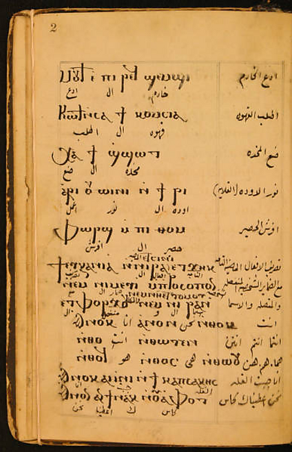 Как письменный язык коптский сосуществовал сначала с греческим, а с VII века с арабским — мусульманское завоевание Египта арабами произошло с распространением ислама именно в VII веке. На рубеже VIII века халиф Абдуль-Малик ибн Марван постановил, что арабский язык заменит греческий койне и коптский языки в качестве единственного государственного языка. Литературный коптский язык постепенно приходил в упадок, и в течение нескольких сотен лет египетский епископ Северус Ибн аль-Мукаффа счёл необходимым написать Историю патриархов на арабском языке. Однако в церковном плане язык сохранил своё положение, в этот период было составлено много агиографических текстов. До X века коптский язык оставался разговорным языком коренного населения за пределами столицы Египта.
