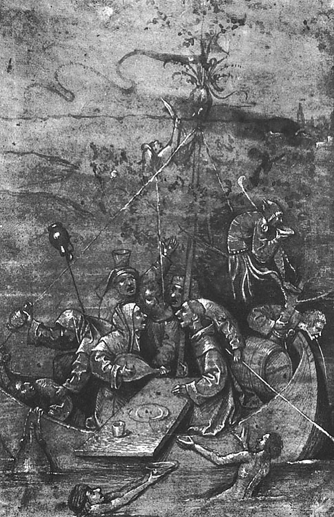 Здесь верховодит шут; по замыслу, его роль — сатирическое обличение обычаев и нравов того времени. Во времена Босха «мудрость» понималась как добродетель, праведность и набожность; «глупость» была синонимом порока, греха и безбожия — фигура дурака с бубенчиками на одежде и с маской на шесте, сидящего особняком, в картине является, безусловно, знаковой. Картину, язвительно повествующую о моральной распущенности духовенства и мирян, считали и зашифрованными алхимическими знаками, и вариацией на тему масленичного «рая пьяниц» — «корабля святого Рёйнерта», на что намекают чаши с вином и перевёрнутый кувшин; её трактовали и как пессимистический взгляд на абсурдность жизни, и как астрологический образ человечества, управляемого Луной, — безвольного и неразумного.