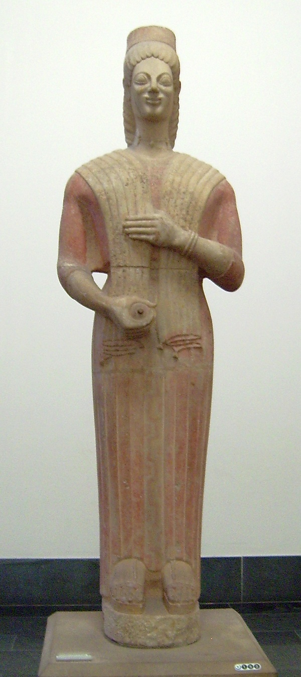 Сложные одеяния, принадлежностью которых был короткий косой хитончик, наброшенный на грудь, скрывают пластику тела, но уже в 30-х годы VI века до н. э. у кор появились строгие дорийские уборы — пеплосы, которые станут основным одеянием классического периода. Формы тела становятся более крепкими, реальными, а к началу грекоперсидских войн улыбка сбегает с архаических лиц[2].