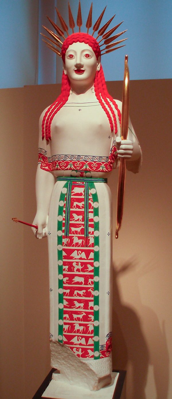 Эти скульптуры в древности были полностью окрашены — полихромными. Цвет подчеркивал жизнеподобие изображения — красками выделялись различные поверхности (волосы, кожа, глаза, ткань); а также служил декоративным целям, как например в случае орнамента на текстиле. Пигмент наносился на поверхность камня с помощью энкаустики: окрашивающие гранулы смешивались с воском (служившим связующим), и получившаяся смесь в горячем виде наносилась на камень. Когда воск, покрывающий поверхность, остывал, он запечатывал таким образом все поры минерала и в некоторой степени защищал его от разрушения.