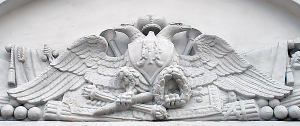 По краям фасады украшают лепные круглые щиты с перекрещенными за ними мечами.