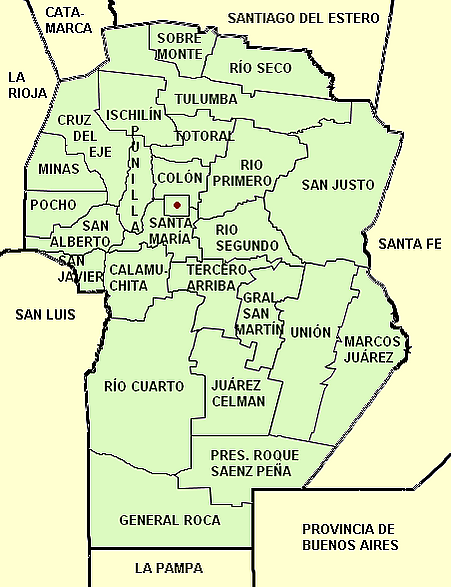 Кордова граничит с провинциями: Катамарка, Сантьяго-дель-Эстеро, Санта-Фе, Буэнос-Айрес, Ла-Пампа, Сан-Луис, Ла-Риоха.