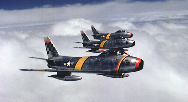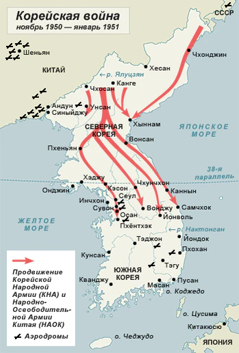 Однако СССР ограничился поддержкой с воздуха, причём советские МиГ-15 не должны были подлетать к линии фронта ближе чем на 100 км. Советские самолёты МиГ-15 одерживали верх над американскими F-80. В ответ США перебросили в зону конфликта более современные F-86. Ещё 25 июня генерал ВВС Ванденберг получил указание о подготовке к нанесению ядерных ударов по военным базам Сибири в случае участия в корейском конфликте Советского Союза[42].