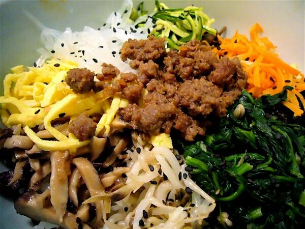 - Пибимпап (придворное название — кольтонбан, кор. 골동반) — варёный рис с паровы́ми овощами, говядиной и варёными яйцами.