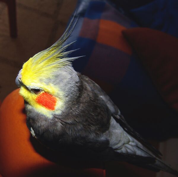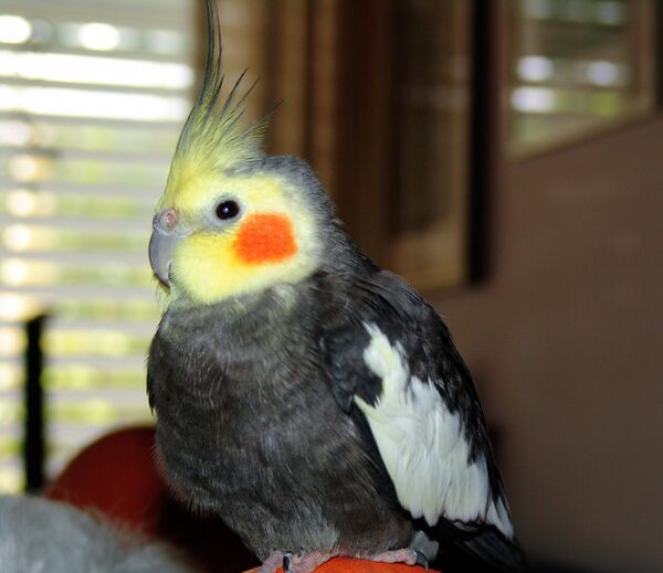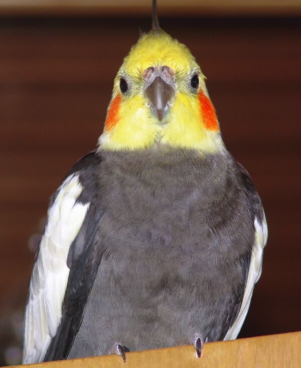 Длина с хвостом 30—33 см, а сам хвост 14—16 см; вес около 100 г. Характерной чертой является довольно высокий хохолок на голове и длинный заострённый хвост. Окраска оперения у самцов и самок разная. Самец окрашен более ярко. Оперение у него тёмно-оливково-серое, хохолок и голова жёлтые. Маховые и рулевые перья бархатно-чёрные, с синевато-серым оттенком. Щёки, передняя часть головы и хохол сернисто-жёлтые, на щеках имеются оранжево-красные пятна. Клюв похож на клюв какаду, но значительно короче. Самки грязно-серого цвета, нижняя сторона тела с буроватым оттенком, на щеках оранжевые пятна. Голова и хохолок у них бледно-серые с желтоватым оттенком. На внутренних опахалах маховых и рулевых перьев расположены овальные пятна бледно-жёлтого цвета, по внешним краям наружных рулевых перьев имеются жёлтые полосы с нижней стороны. У взрослых самцов таких пятен и полос нет. Окраска молодых птенцов такая же, как и у самок, только в возрасте 10—12 месяцев окраска их соответствует взрослым птицам. Из-за простоты разведения этих птиц в неволе было выведено много новых окрасов, что сильно усложняет определение пола.