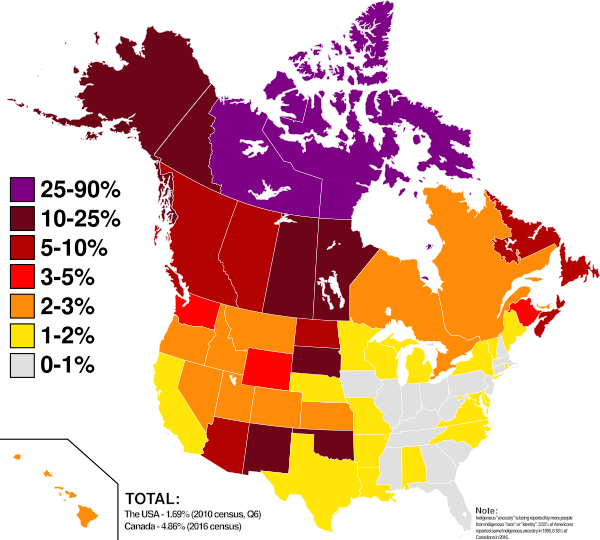 Согласно переписи населения 2016 года, общая численность представителей коренных народов Канады составляла 1 673 785 человек — около 4,9 % от общего числа жителей страны. В том числе насчитывалось 977 230 индейцев, 587 545 метисов и 65 025 инуитов[1]. Представители коренных народов распределены по территории страны неравномерно, на Северо-Западных территориях составляя около половины населения, а на территории Нунавут — значительно больше половины[3]. Почти 75 % канадских инуитов проживают в Арктике[1]. Коренные народы Канады — в среднем самая молодая этническая группа в стране: в 2016 году более 44 % респондентов, относивших себя к этой группе, были моложе 25 лет. Это также самая быстрорастущая этническая группа: за 10 лет между переписями 2006 и 2016 года её численность выросла на 42,5 %[5] (в 4 раза быстрее, чем среди прочих этнических групп). Скорость роста в резервациях и вне их различается: если численность жителей резерваций за 10 лет выросла на 12,8 %, то вне резерваций — на 49,1 %[1].