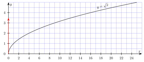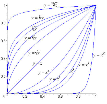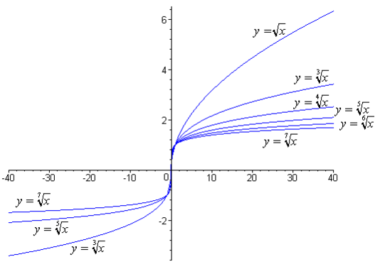 Если рассматривать подкоренное выражение как переменную, мы получим функцию корня -й степени: . Функция корня относится к категории алгебраических функций. График любой функции корня проходит через начало координат и точку .