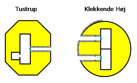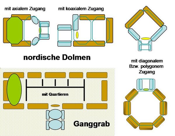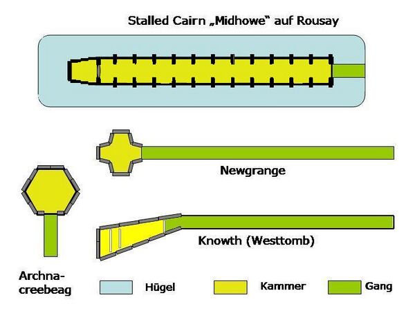 У коридорных гробниц типа каирна нередко имеются крыши с карнизами вместо обычных каменных плит. В ряде гробниц обнаружены памятники мегалитического искусства, вырезанные на камне. Сам коридор в ряде известных случаев имеет такое направление, что солнце просвечивает коридор насквозь в определённый день года, например, зимнего или летнего солнцестояния, весеннего или осеннего равноденствия.