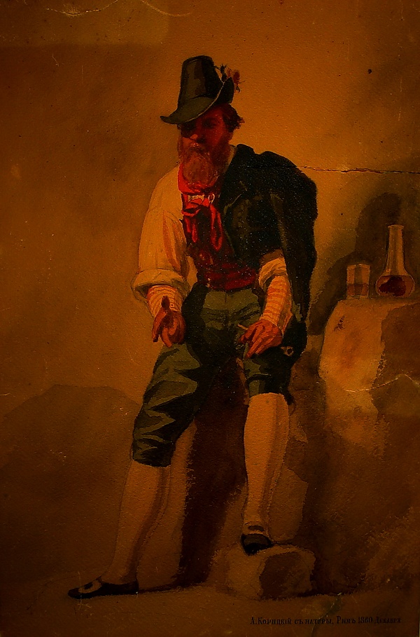 … Майор американской службы, «человек, опытный в железнодорожном деле», был приглашен в Россию в 1842 году по распоряжению Николая I на должность совещательного инженера, для консультаций по вопросам строительства Петербурго-Московской дороги. Семья воссоединилась осенью 1843 года, а с 1844 его сын, будущая европейская знаменитость, Джеймс (Джимми, как называли его близкие) Уистлер уже брал частные уроки у студента Императорской Академии художеств Александра Корицкого, служившего при строительном отряде Главного управления путей сообщения. Знакомство подпоручика Корицкого с майором Джорджем Вашингтоном Уистлером состоялось по делам этого ведомства. Документы свидетельствуют о привязанности к Корицкому всех членов семьи Уистлеров, в первую очередь его подопечного Джимми. Показательны письма 1849 года, отправленные Джеймсом Уистлером в Петербург вскоре после отъезда из России в Лондон. Джимми передавал своему наставнику Корицкому нежные приветы, делился художественными новостями, не сомневался в его частых встречах с отцом, интересовался их совместными походами на выставки и сожалел, что их нет рядом… /…/ … В числе незабываемых событий — знакомство юного Уистлера со знаменитым созданием Брюллова «Последний день Помпеи», которое состоялось во время учебных занятий в Академии художеств, где картина находилась вплоть до 1851 года. Имя и творчество Брюллова постоянно обсуждалось в этой семье благодаря Корицкому, который вошел в круг любимых воспитанников Брюллова, стал одним из самых близких его помощников…