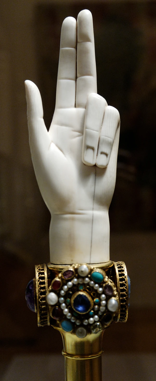 Ещё один жезл, вручаемый королю во время коронации — жезл милосердия (фр. verge de clémence) или рука правосудия (фр. main de justice). Это короткий жезл, увенчанный рукой из слоновой кости (в средневековых документах часто говорили о кости единорога). Изображена правая рука с тремя поднятыми для благословения пальцами (большой, указательный и средний). В Сен-Дени хранилось несколько рук правосудия, но в 1794 году ни одна из них не была признана достаточно значимой для сохранения в Музее французских монументов.