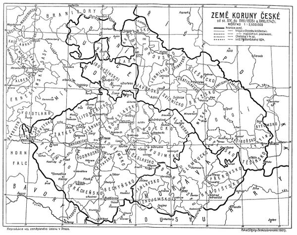 - герцогство Силезия (Slezsko), приобретённое в 1335 году по Тренчинскому договору между королём Яном Слепым и королём Польши Казимиром III. Королева Мария Терезия передала Силезию в 1742 году прусскому королю Фридриху II по Бреславльскому миру, за исключением Австрийской Силезии.