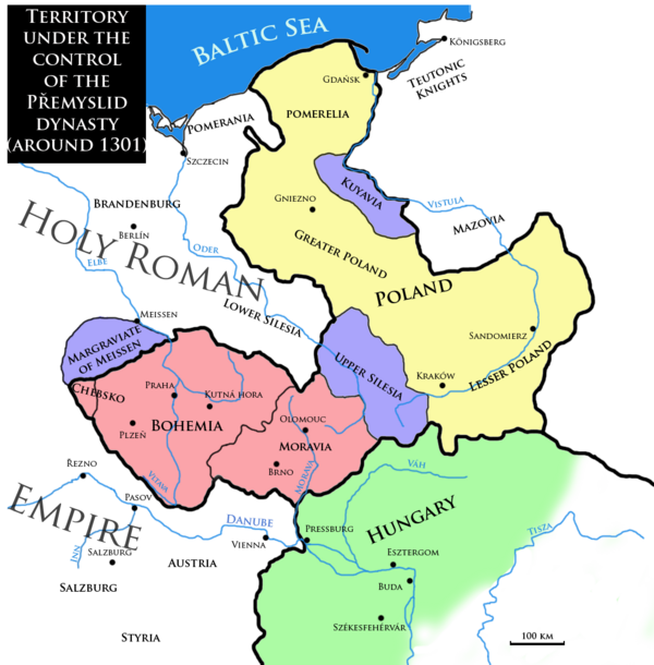 Во время правления последних Пршемысловичей и первых Люксембургов Богемское королевство было самым могущественным государством в Священной Римской империи. Король Пржемысл II Отакар правил землями от Австрии до Адриатического моря. Король Вацлав II в 1300 году был коронован королём Польши, а его сын Вацлав III — королём Венгрии через год. Теперь Чешское королевство простиралось от Венгрии до Балтийского моря.