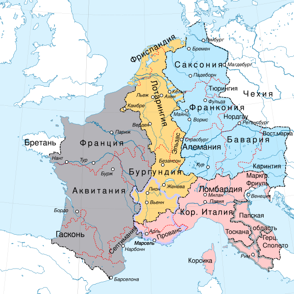 Каролингская империя после Прюмского договора 855 года Королевство Лотаря II Королевство Людовика II Королевство Людовика Немецкого Королевство Карла II Лысого Королевство Карла Прованского |