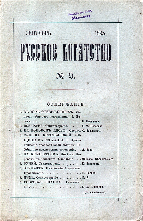 В 1895—1900 годах Короленко живёт в Петербурге. Он редактирует журнал «Русское богатство» (главный редактор с 1904 года). В этот период публикуются новеллы «Марусина заимка» (1899), «Мгновение» (1900).
