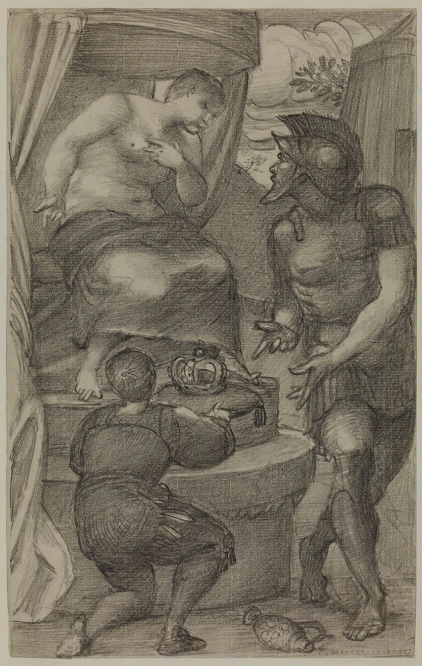 Первоначальная версия картины была написана в 1862 году, хранится в галерее Тейт[17]. Сохранилось несколько этюдов к окончательной версии картины. На небольшом рисунке гуашью (примерно 1883 год, сейчас в коллекции Э. Ллойда Уэббера[18]) фигуры девушки и короля гораздо ближе друг к другу, чем на окончательной версии. На полномасштабной зарисовке на картоне гуашью и цветным мелом композиция приобретает окончательную форму, зато световое решение полностью отличается (1883, этюд находится в Музее и художественной галерее Бирмингема)[19].