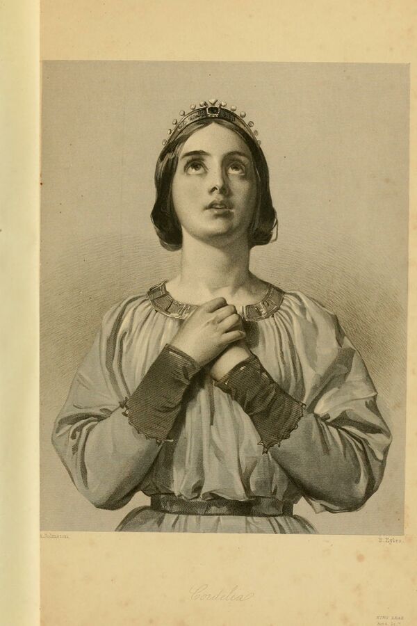 В Британии в IX веке до н. э.[1] легендарный король Лир на склоне лет решает удалиться от дел и разделить своё королевство между тремя дочерьми. Для определения размеров их частей он просит каждую из них сказать, как сильно она его любит. Старшая, Гонерилья, высказывается первой, льстиво заявляя о своей любви к отцу. Тронутый лестью, Лир отдаёт Гонерилье её долю сразу после речи, даже не выслушав её сестёр. Далее он просит высказаться Регану и дарует ей также треть королевства. Когда же приходит черёд высказаться младшей и самой любимой дочери — Корделии, — она отказывается говорить («Ничего, милорд»), объясняя, что она не умеет «высказываться вслух», честно и прямо заявляя, что любит его «как долг велит, не больше и не меньше» и что передаст часть любви своему будущему мужу. Разгневанный отец отрекается от младшей дочери и делит её наследство пополам между старшими дочерьми.