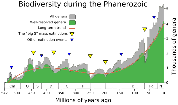 Совместно с А. В. Марковым Коротаев показал применимость гиперболических и гиперэкспоненциальных моделей положительной обратной связи для математического описания макродинамики биологического разнообразия[24] и долгосрочного эволюционного роста размера генома[25]. Коротаев и Марков показали, что динамика родового разнообразия фанерозойской биоты значительно лучше описывается гиперболической моделью, широко используемой в демографии и макросоциологии, чем традиционно привлекавшимися для этой цели экспоненциальными и логистическими моделями, заимствованными из теории динамики популяций. Если последние предполагают отсутствие влияния межтаксонных взаимодействий на динамику разнообразия, за исключением соревнования за свободное экологическое пространство, то гиперболическая модель предполагает наличие в развитии биоты нелинейной положительной обратной связи второго порядка. Коротаев и Марков показали, что в развитии биоты имеется нелинейная положительная обратная связь второго порядка между разнообразием и структурой сообществ (больше родов — выше альфа-разнообразие, то есть среднее число родов в одном сообществе — сообщества становятся более сложными, устойчивыми и «забуференными» — растёт «таксономическая ёмкость» среды и средняя продолжительность существования родов; снижается темп вымирания — рост разнообразия ускоряется)[26]. Разработанная ими математическая модель динамики биоразнообразия, основанная на этом предположении, была подтверждена эмпирическими данными по динамике альфа-разнообразия[27].