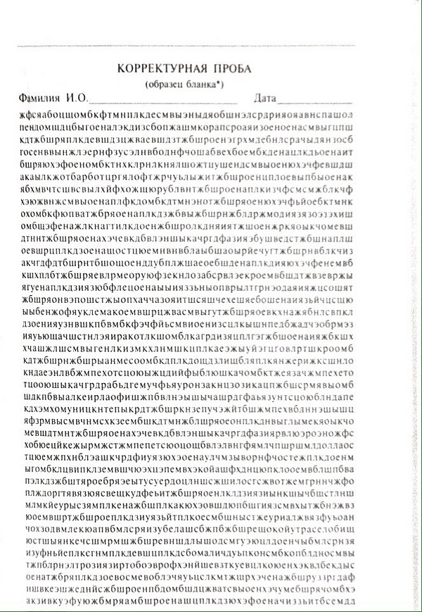 Тест проводится при помощи бланков с большим количеством (несколько сотен или тысяч) случайно расположенными рядами символов (букв, цифр, пиктограмм, колец Ландольта и т.п.). Испытуемому необходимо, просматривая бланк, ряд за рядом, вычёркивать из него указанные в инструкции символы. После команды «Начали!» экспериментатор включает секундомер и по прошествии каждой минуты ставит пометку в месте, где держит карандаш в этот момент испытуемый. Длительность проведения методики может составлять 3, 5 или 10 минут, в зависимости от задачи[2].