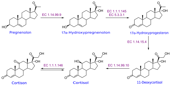 Прегненолон выходит из митохондрий и превращается в прогестерон с помощью 3 β-гидроксистероиддегидрогеназы и изомеразы. В эндоплазматическом ретикулуме (ЭР) этот прогестерон превращается в 17 α-гидроксипрогестерон ферментом 17-стероидгидроксилазой. Дальнейшее гидроксилирование под катализом 21-гидроксилазы приводит к образованию 11-дезоксикортизола, который затем снова превращается в кортизол в митохондриях стероидной 11-β-гидроксилазой. Все описанные ферменты представляют собой специфические железосодержащие ферменты цитохрома Р450. При дефекте ферментов биосинтеза кортизола (в основном 21-гидроксилазы) секреция АКТГ не ингибируется кортизолом посредством отрицательной обратной связи, и в нём накапливаются предшественники 11-дезоксикортизола. В настоящее время их можно все чаще использовать для синтеза андрогенов, и в качестве клинической картины возникает адреногенитальный синдром.