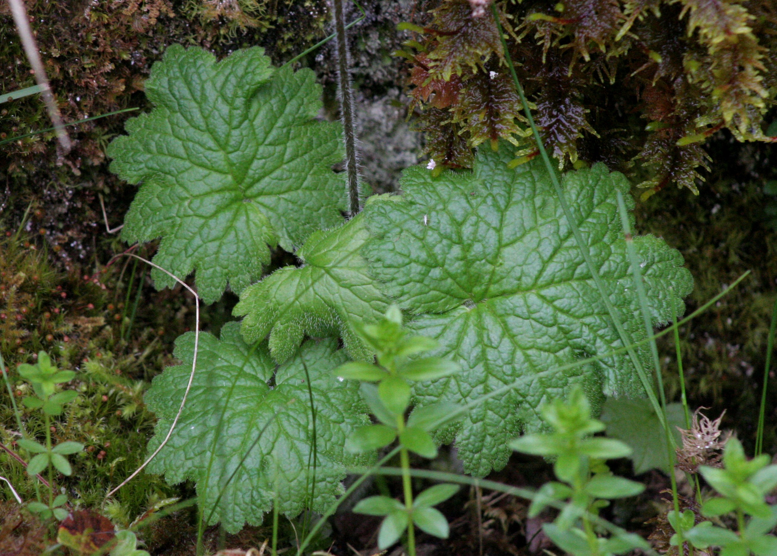 Базальные (первичные) листья с длинными, 6—13 см, черешками, в общем очертании округло-почковидные, неглубоко (до 1⁄4 поперечника) надрезанные на 7—13(15) полукруглых тупозубчатых лопастей с зубцами разной величины. Пластинка листа довольно крупная, округлая. Размеры листьев на одном взрослом растении варьируют от 3 до 9 см. Основание листа сердцевидное. Опушение из беловатых (рыжеватых[14][15]) волосков. Сильнее опушены основание стебля и черешки листьев, нижняя сторона листа имеет опушение в основном по жилкам, верхняя сторона почти голая. У проростков, как правило, не более одного — двух листьев, часто с сохранившимися семядолями; при этом листовая пластинка округло-сердцевидная, без лопастей и зубцов. Ювенильные особи также несут один или два, реже три листа, но уже с развитым опушением. Листовые пластинки ювенильных растений — с хорошо различимыми лопастями; иногда на них заметны зубцы первого порядка. У имматурных (переходная форма в период усиленного образования вегетативных органов) особей от двух до четырёх листьев, а листовая пластинка в очертании очень схожа с листовой пластинкой взрослого растения, зубчато-лопастная. У генеративных особей листья могут быть более мелкими, чем у вегетативных[13]:195.
