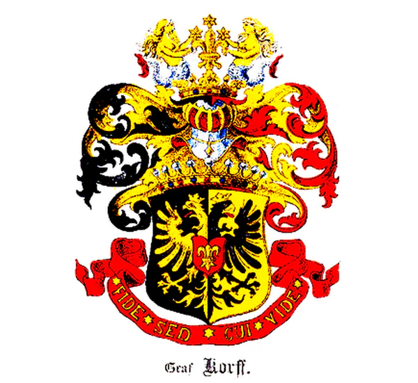 Герб графа Корфа: щит рассечен на чёрное и золотое поля. В нём изображен двуглавый коронованный орел переменных с полями цветов, с красными глазами и языками, имеющий на его груди красный щит с золотой лилией. Щит увенчан графской короной, увенчанной графским коронованным шлемом. Нашлемник: золотая лилия, над ней три шестиконечные звезды. По бокам две сирены с золотыми волосами и лазоревыми хвостами. Намёт: справа чёрный с золотом, слева красный с золотом. Девиз на латинском: «Fide sed cui vide» (Верь тому, что видишь) золотыми буквами на красной ленте[3][4].По семейному преданию, данный герб (золотая лилия французских королей) и девиз, род получил, когда один из его представителей, участвуя в крестовом походе, был ранен, закрыв собой в бою французского короля. Последний, в благодарность за спасение своей жизни и смелость, даровал рыцарю Корф лилию со своего герба, алый щит, в цвет пролитой крови и доблести, и девиз — «Верь тому, что видишь», чтобы ни у кого не было сомнений, что это именно королевская лилия на гербе.