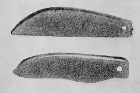 Возможно, эти орудия и не должны были снабжаться рукоятками, о чём свидетельствует подобие рукоятки на некоторых экземплярах, отделённой от лезвия небольшим уступом. На цельнометаллических ножах и бритвах упомянутых культур одиночные отверстия располагаются всегда на заднем конце рукоятки, то есть они служили для прикрепления темляка или какого-то подвеса. Аналогично, косари могли быть готовыми изделиями с отверстиями на заднем конце. В таком случае, рукояткой может служить просто более узкий задний конец, торец которого к тому же, как и обух, прикрывает утолщение-бортик. Рукояткой мог служить даже весь обух изделия (как у ножа улу).