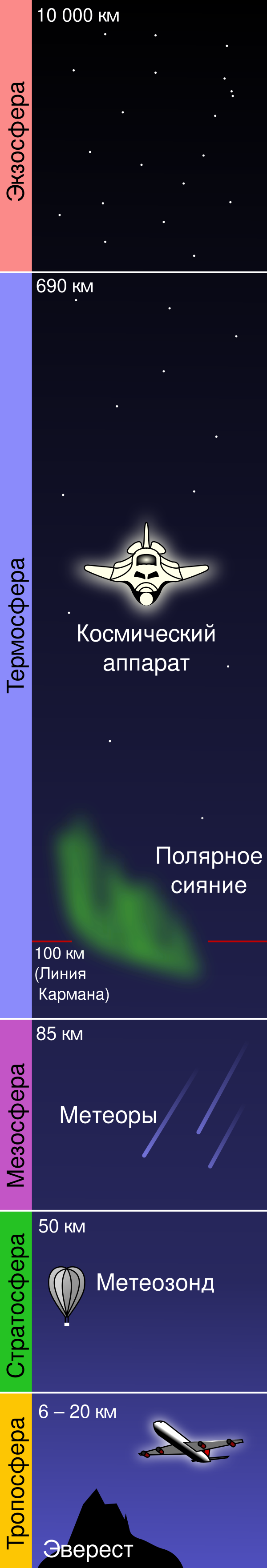 - 60 км — начало ионосферы — области атмосферы, ионизированной солнечным излучением.