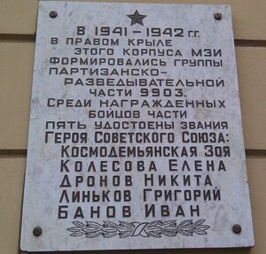- ↑ «Зоя Космодемьянская. Правда о подвиге» // ВГТРК «Россия», 2005 Архивная копия от 17 февраля 2017 на Wayback Machine на youtube.com