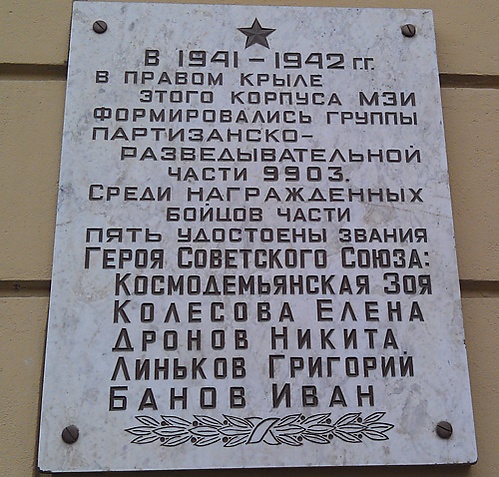 - В память о формировании партизанско-разведывательной части 9903, в которую входили Герои Советского Союза Зоя Космодемьянская, Елена Колесова, Никита Дронов, Григорий Линьков и Иван Банов, на здании МЭИ открыта мемориальная доска.