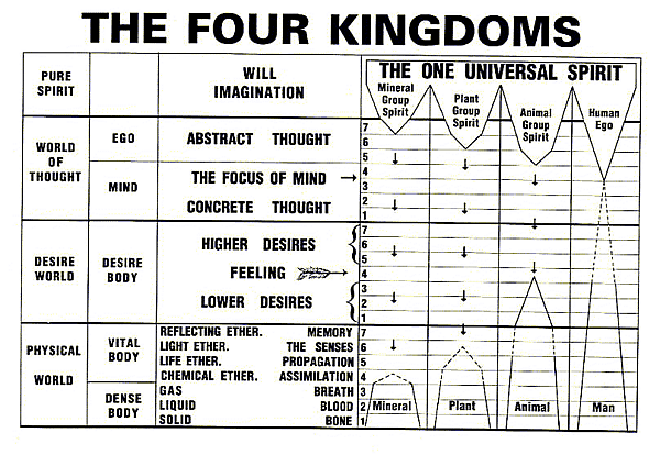 Для опытного ясновидящего эфир[17] так же материален, как твёрдые тела, жидкости и газы химического слоя — для обычных существ. Он видит, как жизненные силы, дающие жизнь минеральным формам, растениям, животным и людям, вливаются в эти формы через эфир в четырёх состояниях».
