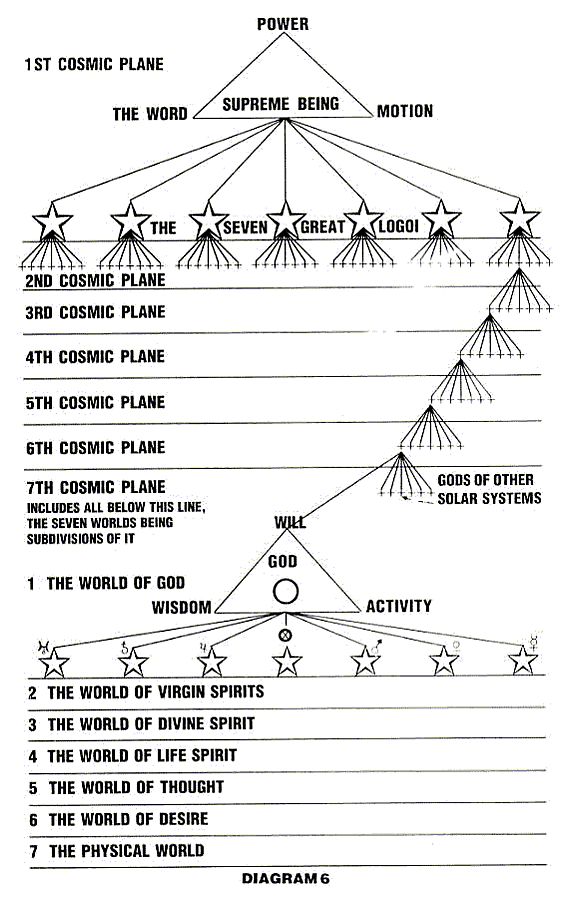 Автор книги утверждает, что из этого «троичного Верховного Бытия исходят семь Великих Логосов». Они содержат в Себе все великие иерархии, всё более и более разнящиеся между собой по мере нисхождения на разные космические планы. На втором космическом плане имеется 49 иерархий; на третьем — 343. Каждая из них делится на семь отделений и подразделений, так что на «низшем космическом плане, где проявляются солнечные системы, число отделений и подразделений почти бесконечно».