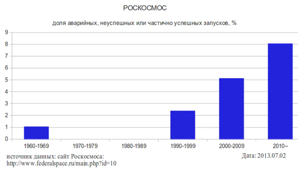 Аварийные пуски: 1992—94 гг. — 152, 3 неудачных (2 %); 1995—99 гг. — 142, 12 неудачных (8,5 %); 2000—2005 гг. — 150, 10 неудачных (6,7 %); 2006—2010 гг. — 141, 6 неудачных (4,3 %); 2010—2013 гг. — 103, 8 неудачных (7,8 %)[225], 2014—2017 гг. — 94, 5 неудачных (5,3 %).