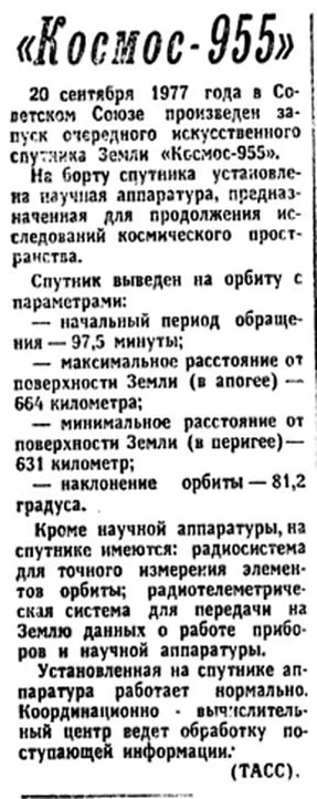 Ранним утром 20 сентября 1977 года на северо-западе России (Карелия, Ленинградская область) и в Финляндии наблюдался ряд аномальных явлений, известных как «Петрозаводский феномен». Этот феномен иностранными исследователями сразу же был связан с запуском спутника «Космос-955»[1][2]. Ракета-носитель, летевшая на северо-восток, оставила в верхних слоях атмосферы характерный многопучковый след из продуктов сгорания, освещённый из-за горизонта восходящим солнцем; в Петрозаводске и других местах к юго-западу от Плесецка этот след наблюдался как своеобразная светящаяся «медуза» на фоне тёмного неба на северо-востоке[2]. В советской открытой печати «Петрозаводский феномен» объяснялся не запуском спутника, а падением метеорита[3], поскольку на тот момент советскими властями официально существование космодрома Плесецк не признавалось[2].