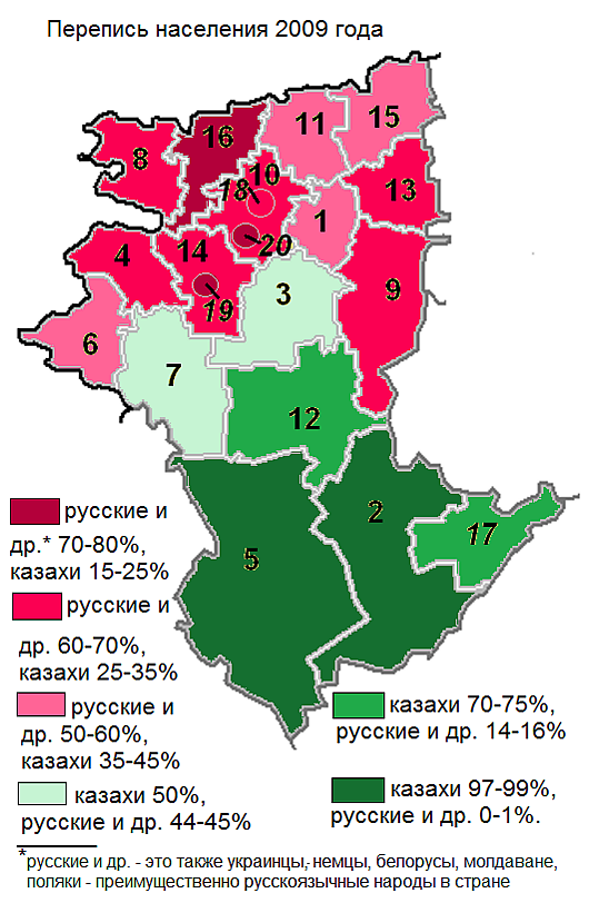 | 18 | Костанай, г.а. | 214961 | 103834 | 48,30 % | 72326 | 33,65 % | 17133 | 7,97 % | 4719 | 2,20 % | 4506 | 2,10 % | 3085 | 1,44 % | 569 | 0,26 % | 2730 | 1,27 % | 968 | 0,45 % |