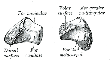 Располагается рядом с трапециевидной костью. Верхняя поверхность кости вогнута и сочленяется с ладьевидной костью. Её нижняя часть имеет седловидную форму, а суставная поверхность сочленяется со I пястной костью. Латеральная поверхность кости сочленяется с трёхгранной костью, а медиальная — с головчатой костью[1].
