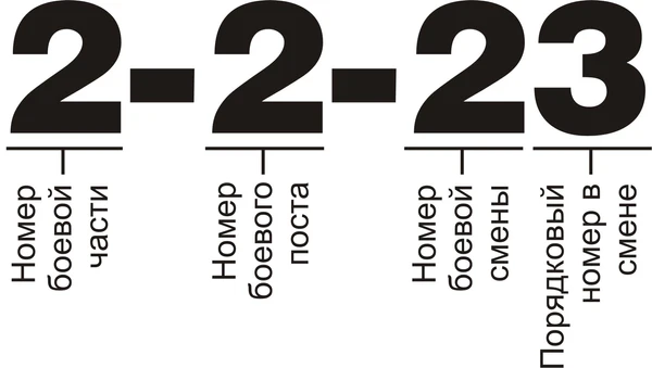 - Вторая часть (одна, две или три цифры) указывает номер боевого поста, где находится старшина или матрос согласно «Расписанию по боевой тревоге»;