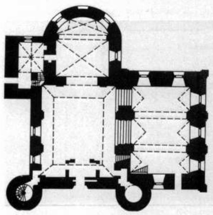 Первоначально храм имел продольно-осевую композицию, был трёхнефным, четырёхколонным, нефы перекрывались крестовыми и звёздчатыми сводами (сохранились в апсиде)[2].