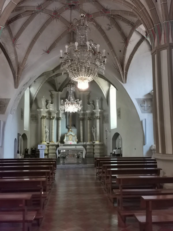 С суровым внешним обликом контрастирует нарядный интерьер храма. Сетчатые нервюрные своды поддерживают две пары изящных восьмигранных пилонов с гранями, сложенными из фасонных кирпичей. Пресбитерий от нефов (одинаковой высоты) отделяет килевидная арка.