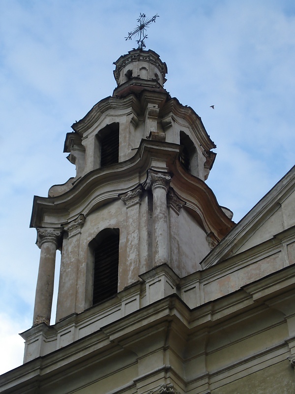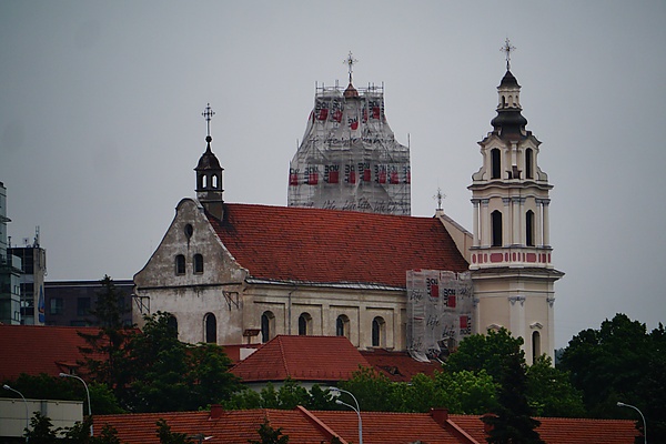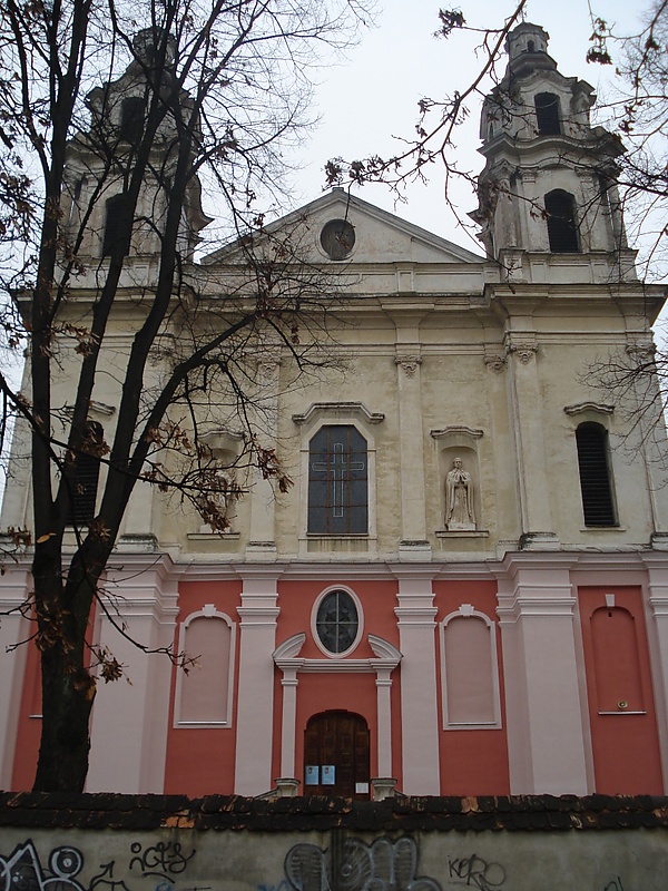 Третий и четвёртый ярусы башен были надстроены в 1752 году архитектором Яном Валентом Дидерштейном при участии, как предполагается, Яна Неземковского. Пластичная композиция башен с колоннами и волютами по углам, изощрённо выгнутыми карнизами, придаёт фасаду грациозность и пышность. В архитектурных формах двух башен храма отражается переход от барокко к рококо. Шлемы сложной формы не характерны для виленского барокко.[3]. Боковые фасады сдержанны и строги.