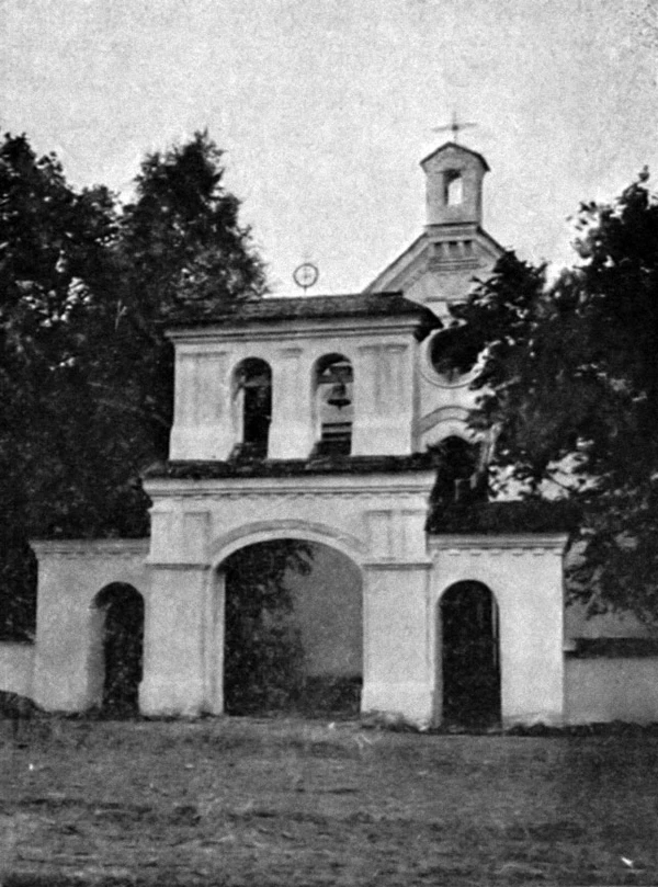 При входе на кладбище по оси часовни расположена ворота-звонница — трехпролетная арка с центральным носовым проходом и двухъярусной колокольней.