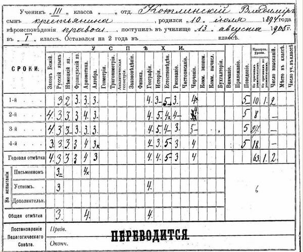 В 1905 году Владимир поступил в Псковское реальное училище. В архивах сохранился его табель успеваемости за 3-й класс[3], из которого видно, что в этом возрасте им показан интерес к естествоведению и черчению при порой удручающих результатах по русскому и иностранным (немецкий и французский) языкам.