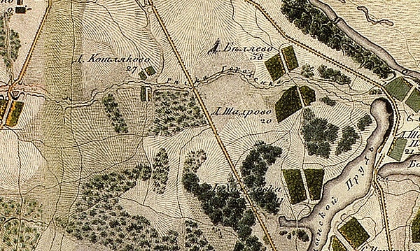 деревня Котлякова на речке на Чертановке… пашни паханые середние земли осмина да наездом пахано десять четей да перелогом и лесом поросло дватцать четыре чети с осминою в поле а в дву потому ж, сена тритцать копен, лесу пашенного пять десятин да лесу ж поверстного вдол на версту, а поперег на полверсты.