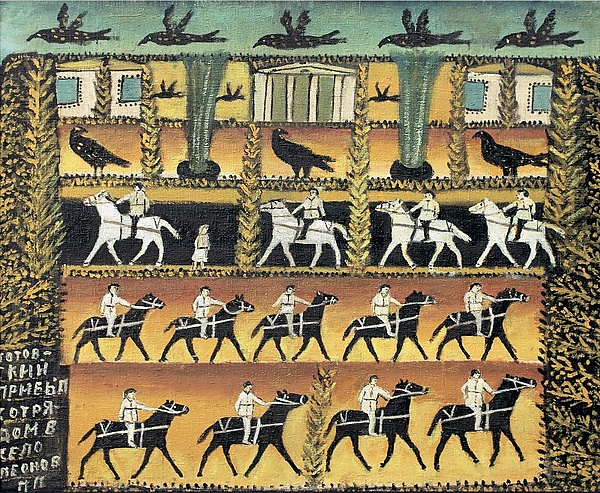 Композиция построена по ярусному принципу и обрамлена жёлтым растительным орнаментом. В верхней части картины размещена полоса синего неба, по которому летят крупные чёрные птицы, украшенные жёлтой крапинкой. Два нижних яруса занимают ряды всадников, движущихся слева направо, а третий ярус выделен четырьмя всадниками на белых конях, направляющимися справа налево. В четвёртом ярусе изображены дома, на которых сидят три чёрные птицы. Строгая ярусная композиция подчёркивает динамику движения и символику изображённых персонажей.
