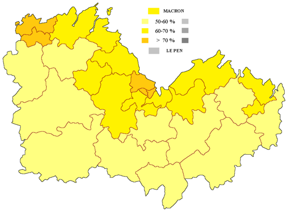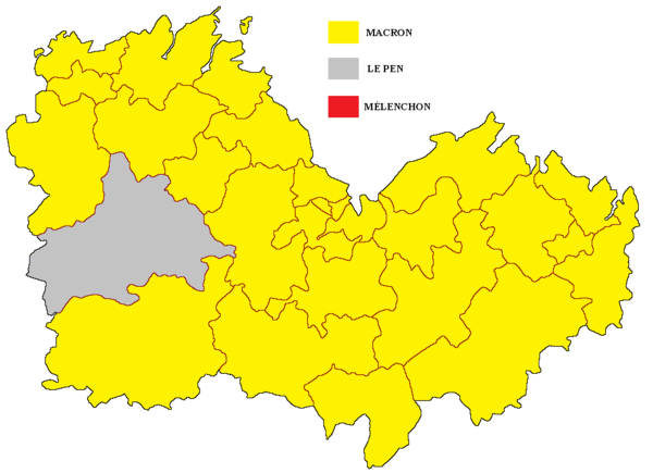 2-й тур: Эмманюэль Макрон — 62,90 % (в целом по стране — 58,55 %); Марин Ле Пен — 37,10 % (в целом по стране — 41,45 %).