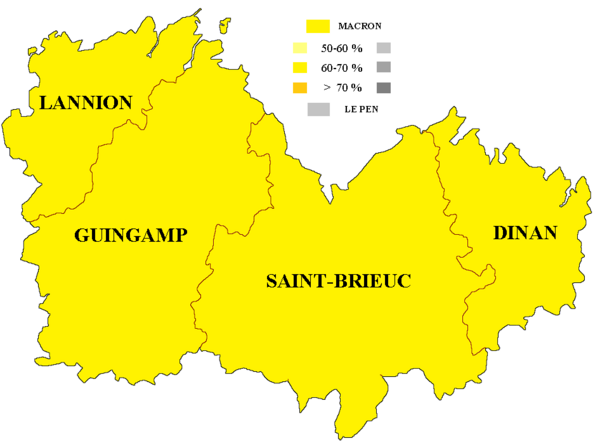 1-й тур: Эмманюэль Макрон ("Вперёд, Республика!") — 31,02 %; Марин Ле Пен (Национальное объединение) — 21,79 %; Жан-Люк Меланшон ("Непокорённая Франция") — 20,26 %; Янник Жадо ("Европа Экология Зелёные") — 5,28 %; Прочие кандидаты — менее 5 %.